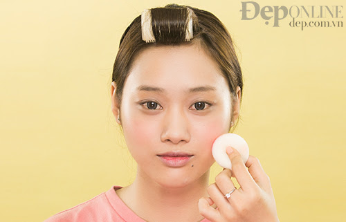 Dùng kem nền dạng lỏng tán lên da, dặm kỹ để lớp nền ăn vào da.