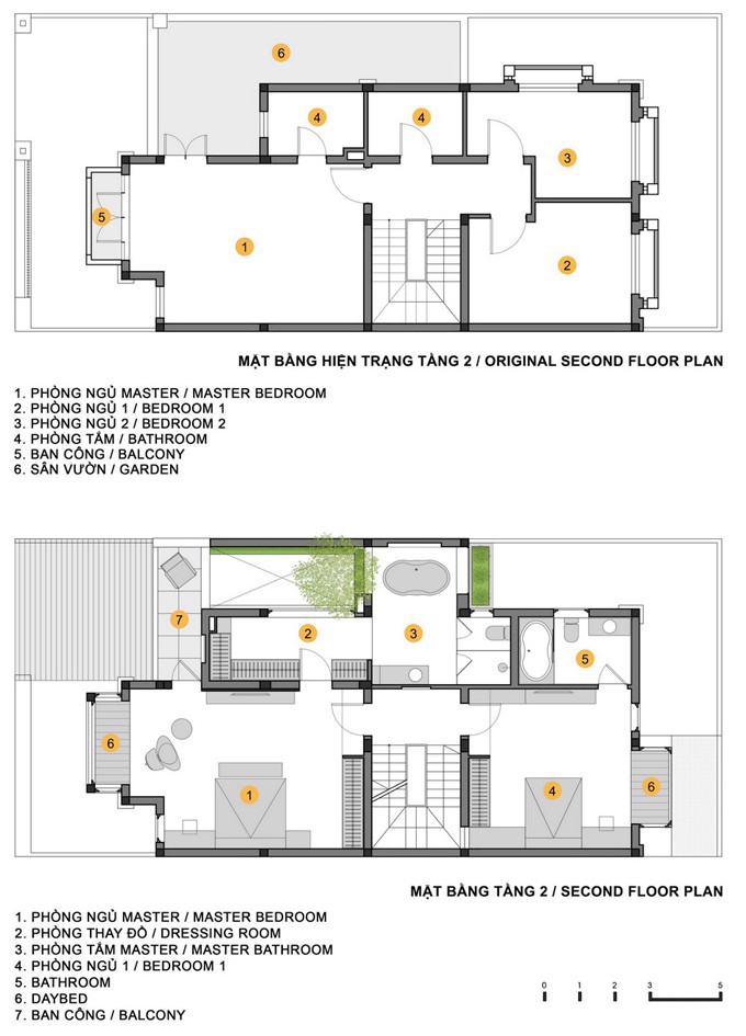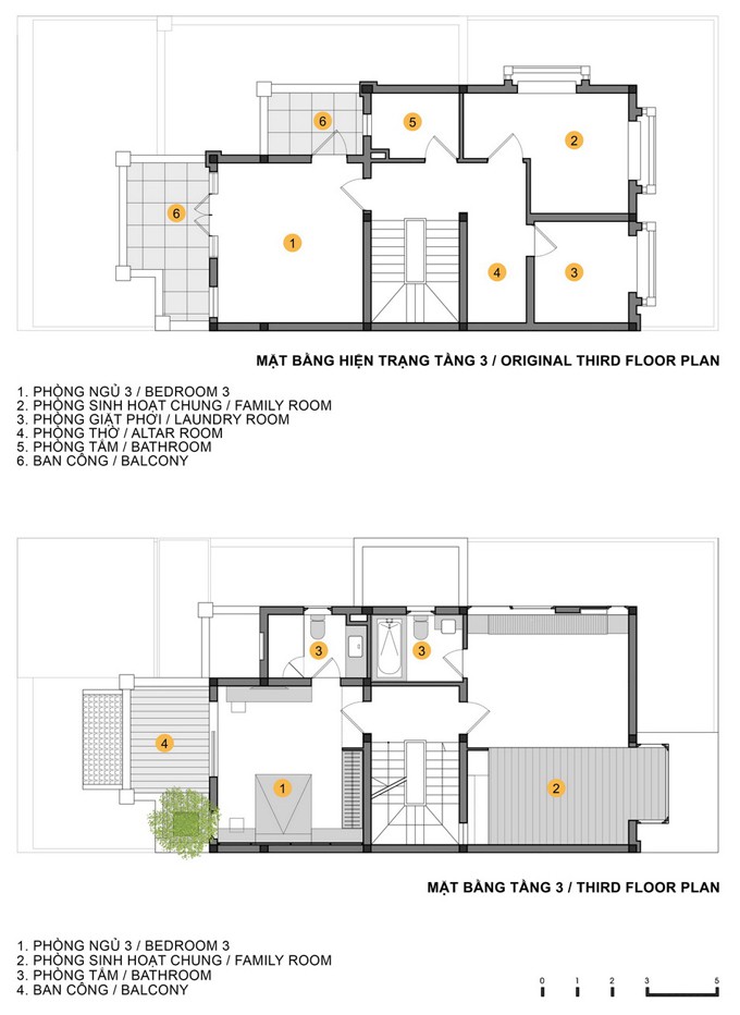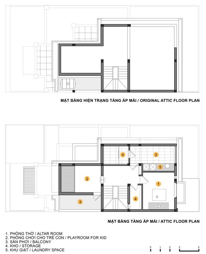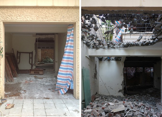 Ngôi nhà 3,5 tầng ở quận Tây Hồ (Hà Nội) xây cách đây 15 năm nên đã trở nên cũ kỹ, lạc hậu, thiếu sáng. Các kiến trúc sư quyết định phá bỏ nhiều tường ngăn và đục cả một phần mái garage để tạo khoảng thông tầng.