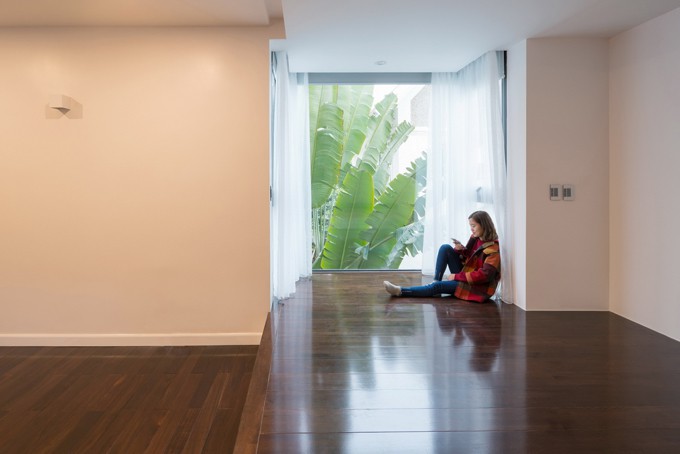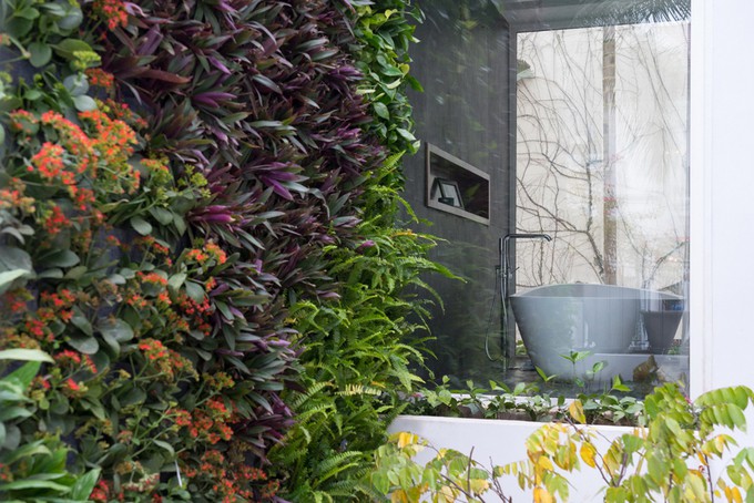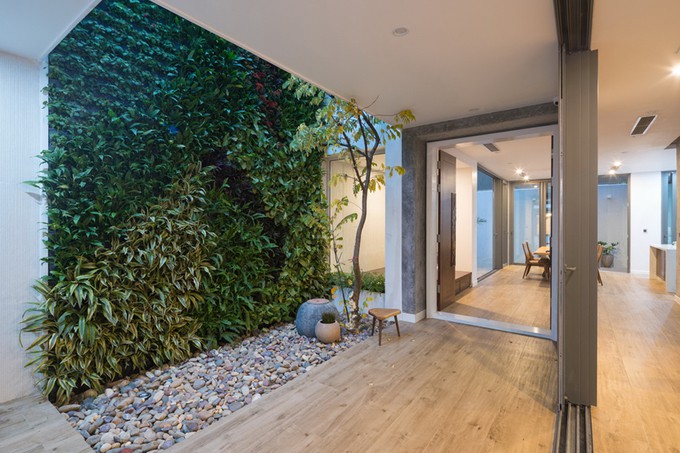 Mảng vườn thẳng đứng cao hai tầng với các loại cây lá phong phú thích hợp với điều kiện trồng trong nhà. Các phòng sử dụng khung cửa kính lớn để tận dụng tối đa nguồn sáng và tầm nhìn xanh mướt.