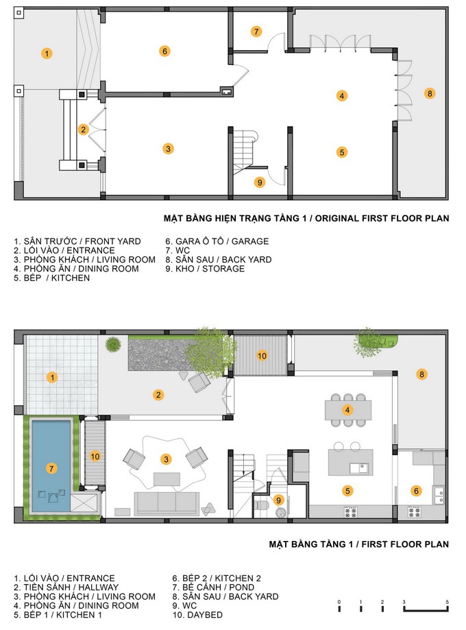Giải pháp này đã thay đổi lối vào nhà từ chỗ bao quanh bởi các bức tường sang sảnh rộng có một phía là vườn cây, phía còn lại là hồ nước.