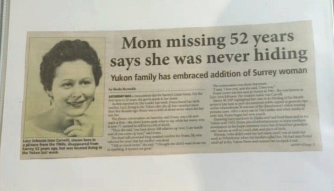 Thật không ngờ, dòng tin nhắn tìm người thân đó đã "phát huy tác dụng". Người phát ngôn của Cảnh sát Hoàng gia Canada, Bert Paquet, cho biết: "Chúng tôi đã nhận được cú điện thoại từ một phụ nữ ở Yukon. Một phụ nữ đã gọi điện và tuyên bố rằng cô đã nhìn thấy bức ảnh của người mất tích trong các tờ báo miễn phí và nói rằng người mất tích mà chúng tôi tìm kiếm thực ra là mẹ cô ấy".